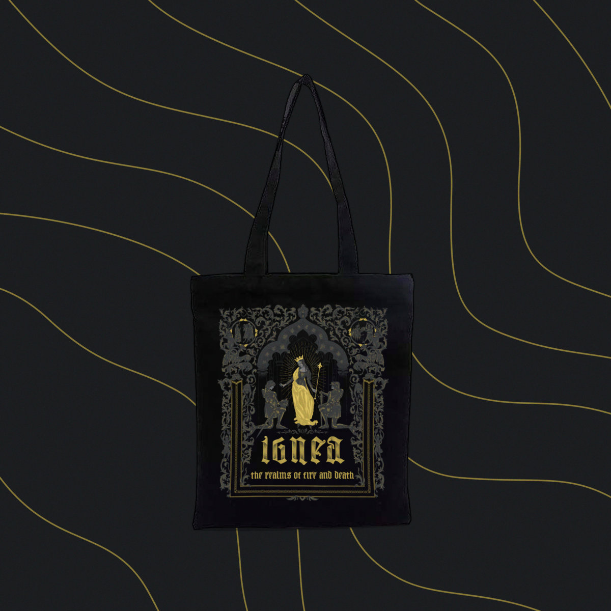 100% cotton black tote bag with The Realms of Fire and Death artwork.